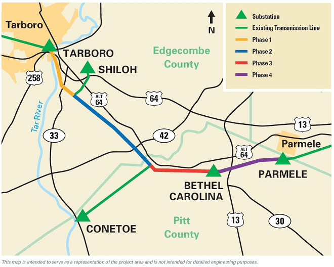We are rebuilding an aging 115 kilovolt (kV) single- and double-circuit electric transmission line between our Tarboro and Parmele substations in the counties of Edgecombe and Pitt, North Carolina, between the towns of Tarboro and Parmele.