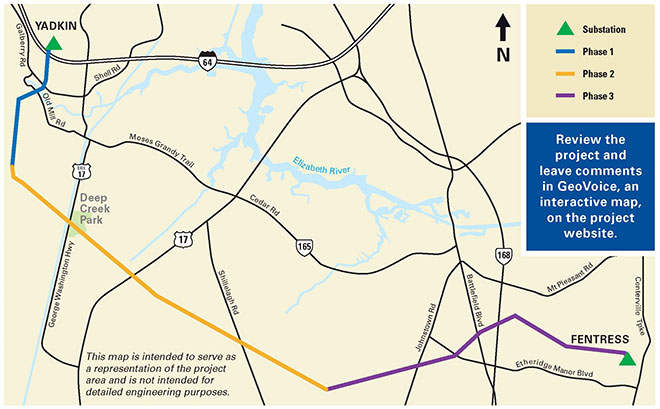 En Dominion Energy, nos dedicamos a mantener un servicio eléctrico confiable y seguro en las comunidades a las que servimos. El proyecto de la línea de transmisión eléctrica Yadkin-Fentress de 500 kilovoltios (kV) reconstruye aproximadamente 13.5 millas de la línea de transmisión existente de 500 kV que va desde la subestación Yadkin en Yadkin Road hasta la subestación Fentress en Meredith Drive y Fentress Loop en Chesapeake, Virginia.