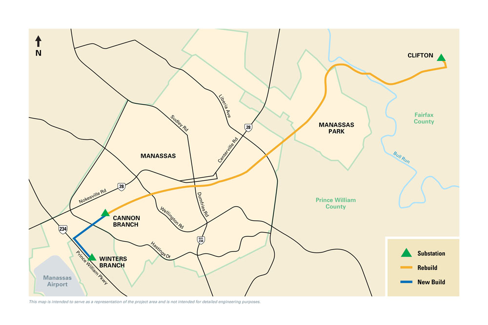 The portion of the 230 kilovolt (kV) line to be rebuilt runs from just outside our Cannon Branch substation, south of Nokesville Road in Prince William County, through the City of Manassas, and terminates at our Clifton substation near Clifton Creek Drive in Fairfax County.